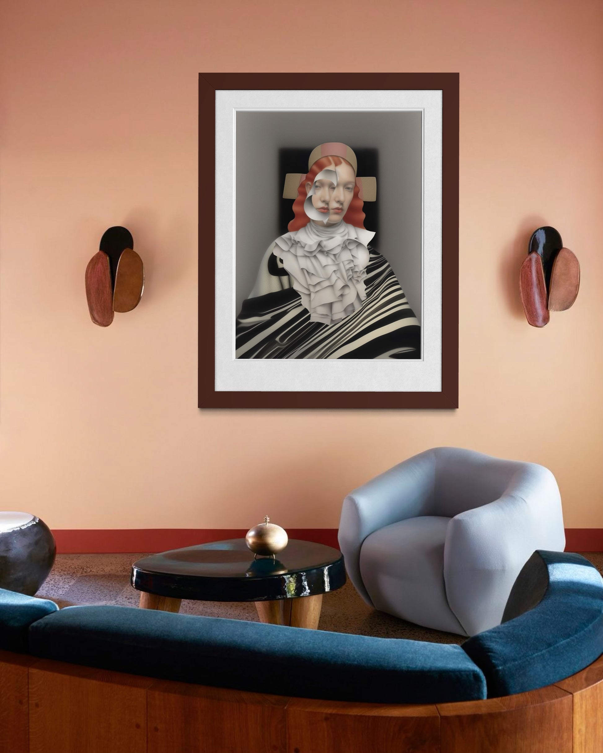 This work layers mirrored faces and sculptural forms into a single, composed figure — part relic, part apparition. The softened palette, architectural framing, and veiled symmetry evoke classical portraiture filtered through a contemporary, surreal lens. It feels devotional and detached at once: intimate, ceremonial, and slightly uncanny.