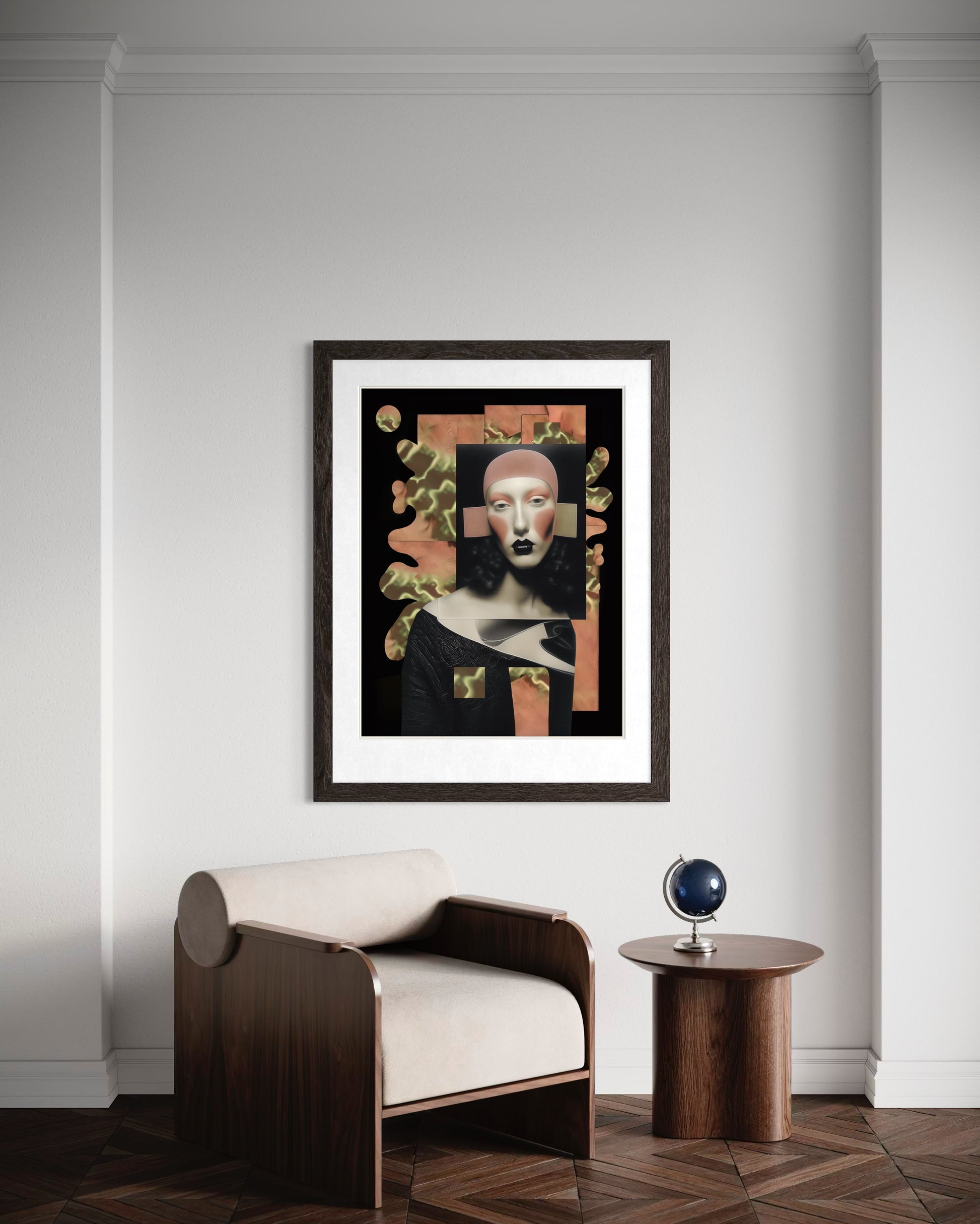 Mind Silk layers a stark, ceremonial figure against fragmented fields of pattern and void. The face is poised and lacquered — almost mask-like — while surrounding forms dissolve into liquid geometry and interrupted planes. There’s a tension between elegance and disruption, polish and fracture, surface and psyche.